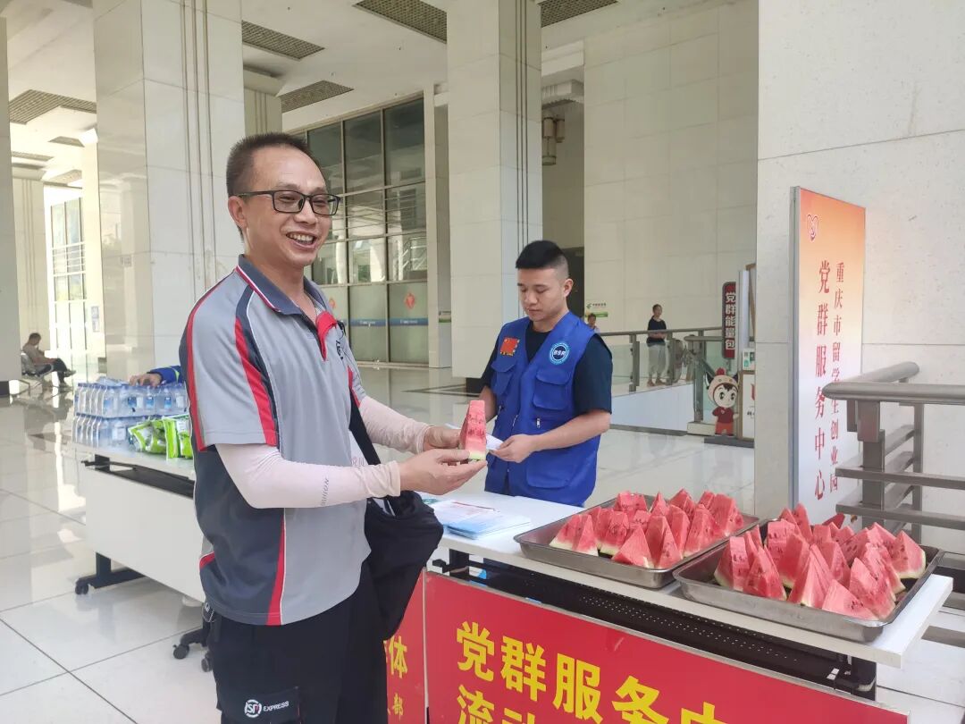 此次活动在留创园园区内设定了2个流动点,依托企业党支部党员职工、蓝天救援队等群体组建的“好二郎”志愿服务队,设立了“红岩先锋”党员志愿岗,使其积极参与到回报社会“先锋”行动中,为来往园区的快递员、外卖员、快递小哥等60位新就业群体送去关怀。